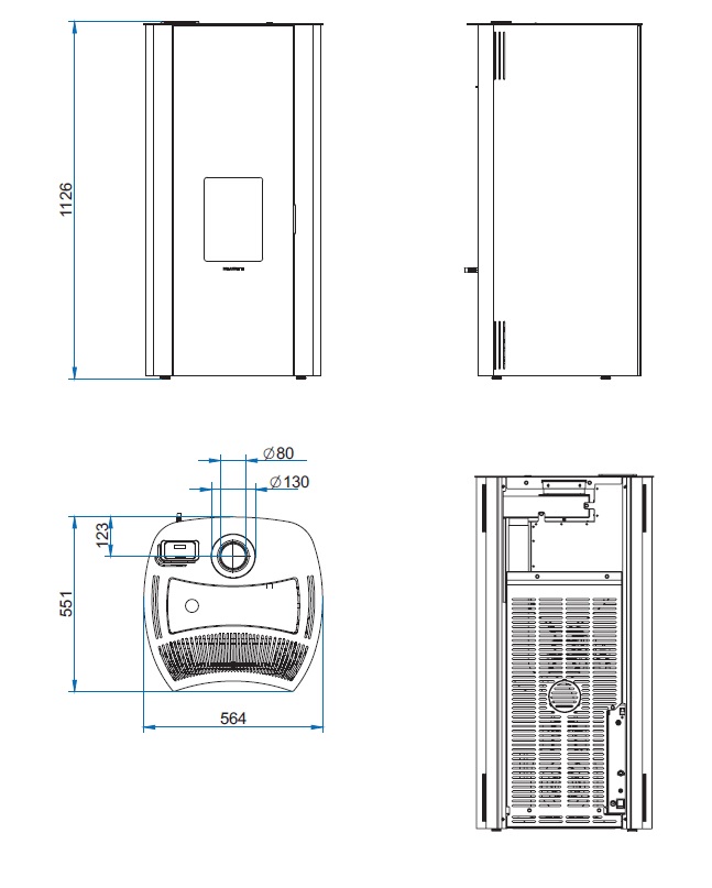 • voorzien voor de rookafvoer en de luchttoevoer aan de bovenzijde door middel van een coaxiale buis geïntegreerd in de geometrie van de kachel